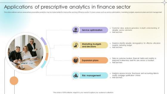 This slide outlines various areas where prescriptive analytics may be implemented to improve the working of finance sector. It covers areas such as service optimization, marketing budgets, expansion plans and risk management.Present like a pro with Applications Of Prescriptive Analytics In Finance Sector Data Analytics SS V. Create beautiful presentations together with your team, using our easy-to-use presentation slides. Share your ideas in real-time and make changes on the fly by downloading our templates. So whether you are in the office, on the go, or in a remote location, you can stay in sync with your team and present your ideas with confidence. With Slidegeeks presentation got a whole lot easier. Grab these presentations today. This slide outlines various areas where prescriptive analytics may be implemented to improve the working of finance sector. It covers areas such as service optimization, marketing budgets, expansion plans and risk management.