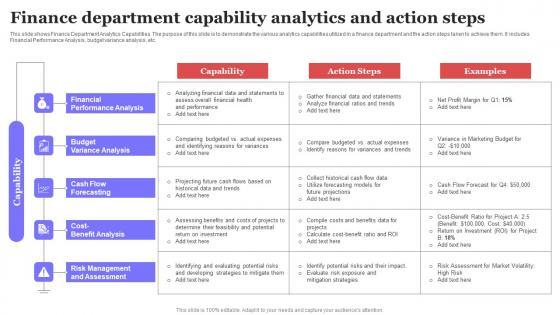This slide shows Finance Department Analytics Capabilities. The purpose of this slide is to demonstrate the various analytics capabilities utilized in a finance department and the action steps taken to achieve them. It includes Financial Performance Analysis, budget variance analysis, etc. Showcasing this set of slides titled Finance Department Capability Analytics And Action Steps Ppt Layouts Templates PDF. The topics addressed in these templates are Financial Performance,Analysis, Budget Variance Analysis. All the content presented in this PPT design is completely editable. Download it and make adjustments in color, background, font etc. as per your unique business setting. This slide shows Finance Department Analytics Capabilities. The purpose of this slide is to demonstrate the various analytics capabilities utilized in a finance department and the action steps taken to achieve them. It includes Financial Performance Analysis, budget variance analysis, etc.