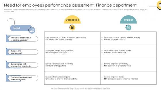 This slide illustrate various need why we should conduct employees performance assessment for finance department to boost stability. It includes needs such as financial analysis and reporting accuracy, budget and cost control etc. Do you have to make sure that everyone on your team knows about any specific topic I yes, then you should give Need For Employees Performance Assessment Finance Department Skill Enhancement Performance a try. Our experts have put a lot of knowledge and effort into creating this impeccable Need For Employees Performance Assessment Finance Department Skill Enhancement Performance. You can use this template for your upcoming presentations, as the slides are perfect to represent even the tiniest detail. You can download these templates from the Slidegeeks website and these are easy to edit. So grab these today This slide illustrate various need why we should conduct employees performance assessment for finance department to boost stability. It includes needs such as financial analysis and reporting accuracy, budget and cost control etc.