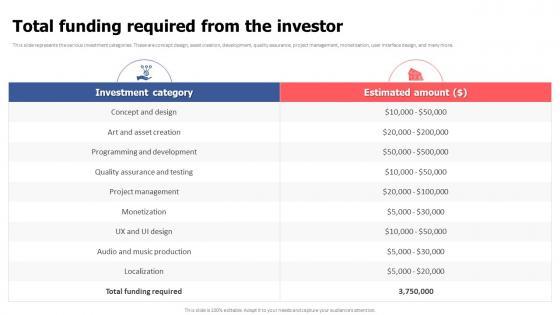 This slide represents the various investment categories. These are concept design, asset creation, development, quality assurance, project management, monetization, user interface design, and many more. This Total Funding Required From The Investor Video Game Financing Pitch Deck is perfect for any presentation, be it in front of clients or colleagues. It is a versatile and stylish solution for organizing your meetings. The Total Funding Required From The Investor Video Game Financing Pitch Deck features a modern design for your presentation meetings. The adjustable and customizable slides provide unlimited possibilities for acing up your presentation. Slidegeeks has done all the homework before launching the product for you. So, do not wait, grab the presentation templates today This slide represents the various investment categories. These are concept design, asset creation, development, quality assurance, project management, monetization, user interface design, and many more.