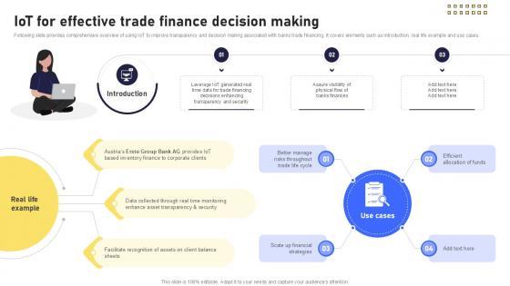 Following slide provides comprehensive overview of using IoT to improve transparency and decision making associated with banks trade financing. It covers elements such as introduction, real life example and use cases. If you are looking for a format to display your unique thoughts, then the professionally designed IoT For Effective Trade Finance Decision Making IoT In Banking For Digital Future IoT SS V is the one for you. You can use it as a Google Slides template or a PowerPoint template. Incorporate impressive visuals, symbols, images, and other charts. Modify or reorganize the text boxes as you desire. Experiment with shade schemes and font pairings. Alter, share or cooperate with other people on your work. Download IoT For Effective Trade Finance Decision Making IoT In Banking For Digital Future IoT SS V and find out how to give a successful presentation. Present a perfect display to your team and make your presentation unforgettable. Following slide provides comprehensive overview of using IoT to improve transparency and decision making associated with banks trade financing. It covers elements such as introduction, real life example and use cases.