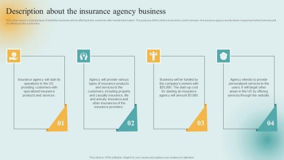 This slide covers a brief glimpse of what the business will be offering to the customer with market information. The purpose of this slide is to provide a brief overview of insurance agency and its future impact and what business will be offering to the customers. Boost your pitch with our creative Insurance Firm Start Up Financial Description About The Insurance Agency Business Diagrams Pdf. Deliver an awe-inspiring pitch that will mesmerize everyone. Using these presentation templates you will surely catch everyones attention. You can browse the ppts collection on our website. We have researchers who are experts at creating the right content for the templates. So you do not have to invest time in any additional work. Just grab the template now and use them. This slide covers a brief glimpse of what the business will be offering to the customer with market information. The purpose of this slide is to provide a brief overview of insurance agency and its future impact and what business will be offering to the customers.