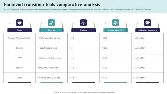 This slide presents top financial transformation tools and solutions for organisations, helpful in managing quick and easy evolution. It includes Redwood Finance Automation, Blackline, PWC, Deloitte and Accenture Pitch your topic with ease and precision using this Financial Transition Tools Comparative Analysis Infographics Pdf This layout presents information on Redwood Finance Automation, Financial Process It is also available for immediate download and adjustment. So, changes can be made in the color, design, graphics or any other component to create a unique layout. This slide presents top financial transformation tools and solutions for organisations, helpful in managing quick and easy evolution. It includes Redwood Finance Automation, Blackline, PWC, Deloitte and Accenture