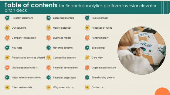Explore a selection of the finest Table Of Contents For Financial Analytics Solution Investor Funding Elevator Pitch Deck Ideas PDF here. With a plethora of professionally designed and pre made slide templates, you can quickly and easily find the right one for your upcoming presentation. You can use our Table Of Contents For Financial Analytics Solution Investor Funding Elevator Pitch Deck Ideas PDF to effectively convey your message to a wider audience. Slidegeeks has done a lot of research before preparing these presentation templates. The content can be personalized and the slides are highly editable. Grab templates today from Slidegeeks.