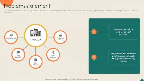 This slide exhibits problems investors face by purchasing each collateral workflow management tool. It includes workflow lifecycle such as structuring and monitoring, data validation, data reporting, loan level data, and funds flow statistics. Slidegeeks is here to make your presentations a breeze with Problems Statement Financial Analytics Platform Investor Elevator Pitch Deck With our easy-to-use and customizable templates, you can focus on delivering your ideas rather than worrying about formatting. With a variety of designs to choose from, you are sure to find one that suits your needs. And with animations and unique photos, illustrations, and fonts, you can make your presentation pop. So whether you are giving a sales pitch or presenting to the board, make sure to check out Slidegeeks first This slide exhibits problems investors face by purchasing each collateral workflow management tool. It includes workflow lifecycle such as structuring and monitoring, data validation, data reporting, loan level data, and funds flow statistics.