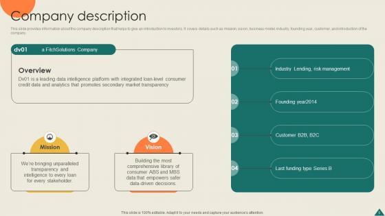 This slide provides information about the company description that helps to give an introduction to investors. It covers details such as mission, vision, business model, industry, founding year, customer, and introduction of the company. Slidegeeks has constructed Company Description Financial Analytics Platform Investor Elevator Pitch Deck after conducting extensive research and examination. These presentation templates are constantly being generated and modified based on user preferences and critiques from editors. Here, you will find the most attractive templates for a range of purposes while taking into account ratings and remarks from users regarding the content. This is an excellent jumping-off point to explore our content and will give new users an insight into our top-notch PowerPoint Templates. This slide provides information about the company description that helps to give an introduction to investors. It covers details such as mission, vision, business model, industry, founding year, customer, and introduction of the company.