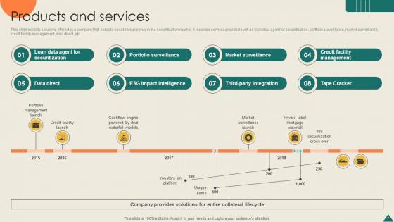 This slide exhibits solutions offered by a company that helps to boost transparency in the securitization market. It includes services provided such as loan data agent for securitization, portfolio surveillance, market surveillance, credit facility management, data direct, etc. Do you have an important presentation coming up Are you looking for something that will make your presentation stand out from the rest Look no further than Products And Services Financial Analytics Platform Investor Elevator Pitch Deck. With our professional designs, you can trust that your presentation will pop and make delivering it a smooth process. And with Slidegeeks, you can trust that your presentation will be unique and memorable. So why wait Grab Products And Services Financial Analytics Platform Investor Elevator Pitch Deck today and make your presentation stand out from the rest This slide exhibits solutions offered by a company that helps to boost transparency in the securitization market. It includes services provided such as loan data agent for securitization, portfolio surveillance, market surveillance, credit facility management, data direct, etc.