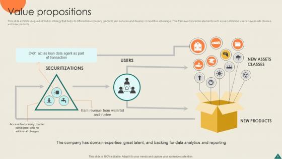 This slide exhibits unique distribution strategy that helps to differentiate company products and services and develop competitive advantage. This framework includes elements such as securitization, users, new assets classes, and new products. If you are looking for a format to display your unique thoughts, then the professionally designed Value Propositions Financial Analytics Platform Investor Elevator Pitch Deck is the one for you. You can use it as a Google Slides template or a PowerPoint template. Incorporate impressive visuals, symbols, images, and other charts. Modify or reorganize the text boxes as you desire. Experiment with shade schemes and font pairings. Alter, share or cooperate with other people on your work. Download Value Propositions Financial Analytics Platform Investor Elevator Pitch Deck and find out how to give a successful presentation. Present a perfect display to your team and make your presentation unforgettable. This slide exhibits unique distribution strategy that helps to differentiate company products and services and develop competitive advantage. This framework includes elements such as securitization, users, new assets classes, and new products.