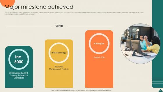 This slide highlights major milestones achieved by the company in context with ranking achieved. Common milestones achieved include the fastest-growing private company, best data management product, and most promising private Fintech company. Do you have to make sure that everyone on your team knows about any specific topic I yes, then you should give Major Milestone Achieved Financial Analytics Platform Investor Elevator Pitch Deck a try. Our experts have put a lot of knowledge and effort into creating this impeccable Major Milestone Achieved Financial Analytics Platform Investor Elevator Pitch Deck. You can use this template for your upcoming presentations, as the slides are perfect to represent even the tiniest detail. You can download these templates from the Slidegeeks website and these are easy to edit. So grab these today This slide highlights major milestones achieved by the company in context with ranking achieved. Common milestones achieved include the fastest-growing private company, best data management product, and most promising private Fintech company.