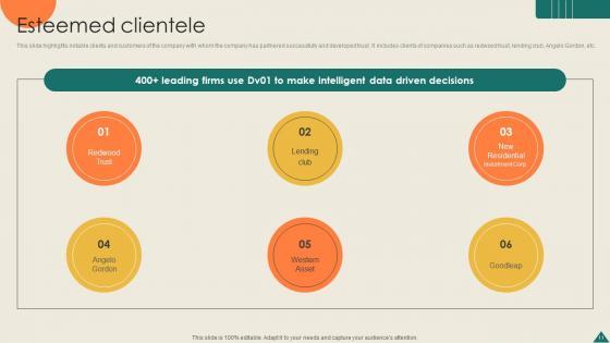 This slide highlights notable clients and customers of the company with whom the company has partnered successfully and developed trust. It includes clients of companies such as redwood trust, lending club, Angelo Gordon, etc. Take your projects to the next level with our ultimate collection of Esteemed Clientele Financial Analytics Platform Investor Elevator Pitch Deck. Slidegeeks has designed a range of layouts that are perfect for representing task or activity duration, keeping track of all your deadlines at a glance. Tailor these designs to your exact needs and give them a truly corporate look with your own brand colors they will make your projects stand out from the rest This slide highlights notable clients and customers of the company with whom the company has partnered successfully and developed trust. It includes clients of companies such as redwood trust, lending club, Angelo Gordon, etc.