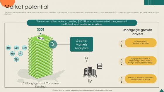 The following slide provides the market potential in order to plan ahead for a better launch of products and services. It includes elements such as market value of US mortgage and consumer lending, and capital market analytics platforms. Get a simple yet stunning designed Market Potential Financial Analytics Platform Investor Elevator Pitch Deck. It is the best one to establish the tone in your meetings. It is an excellent way to make your presentations highly effective. So, download this PPT today from Slidegeeks and see the positive impacts. Our easy-to-edit Market Potential Financial Analytics Platform Investor Elevator Pitch Deck can be your go-to option for all upcoming conferences and meetings. So, what are you waiting for Grab this template today. The following slide provides the market potential in order to plan ahead for a better launch of products and services. It includes elements such as market value of US mortgage and consumer lending, and capital market analytics platforms.