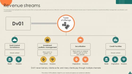 The following slide highlights the revenue model of the company with products and services offered to customers. Some of the products include saas or market surveillance, investment portfolio management, securitization, and credit facilities. Whether you have daily or monthly meetings, a brilliant presentation is necessary. Revenue Streams Financial Analytics Platform Investor Elevator Pitch Deck can be your best option for delivering a presentation. Represent everything in detail using Revenue Streams Financial Analytics Platform Investor Elevator Pitch Deck and make yourself stand out in meetings. The template is versatile and follows a structure that will cater to your requirements. All the templates prepared by Slidegeeks are easy to download and edit. Our research experts have taken care of the corporate themes as well. So, give it a try and see the results. The following slide highlights the revenue model of the company with products and services offered to customers. Some of the products include saas or market surveillance, investment portfolio management, securitization, and credit facilities.