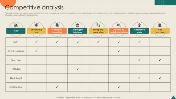 This slide exhibits a competitive analysis of Dv01 with other competitors available in the market based on certain features. It includes features such as a structuring tool, collateral reporting, managed databased, third-party integration, advanced cashflow analytics, etc. Presenting this PowerPoint presentation, titled Competitive Analysis Financial Analytics Platform Investor Elevator Pitch Deck, with topics curated by our researchers after extensive research. This editable presentation is available for immediate download and provides attractive features when used. Download now and captivate your audience. Presenting this Competitive Analysis Financial Analytics Platform Investor Elevator Pitch Deck. Our researchers have carefully researched and created these slides with all aspects taken into consideration. This is a completely customizable Competitive Analysis Financial Analytics Platform Investor Elevator Pitch Deck that is available for immediate downloading. Download now and make an impact on your audience. Highlight the attractive features available with our PPTs. This slide exhibits a competitive analysis of Dv01 with other competitors available in the market based on certain features. It includes features such as a structuring tool, collateral reporting, managed databased, third-party integration, advanced cashflow analytics, etc.