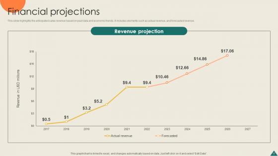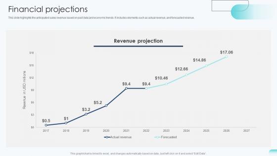 This slide highlights the anticipated sales revenue based on past data and economic trends. It includes elements such as actual revenue, and forecasted revenue. Boost your pitch with our creative Financial Projections Financial Analytics Platform Investor Elevator Pitch Deck. Deliver an awe-inspiring pitch that will mesmerize everyone. Using these presentation templates you will surely catch everyones attention. You can browse the ppts collection on our website. We have researchers who are experts at creating the right content for the templates. So you do not have to invest time in any additional work. Just grab the template now and use them. This slide highlights the anticipated sales revenue based on past data and economic trends. It includes elements such as actual revenue, and forecasted revenue.