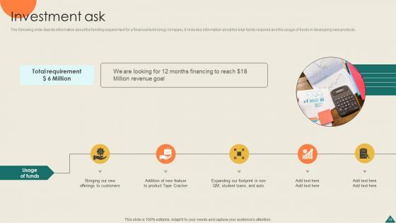 The following slide depicts information about the funding requirement for a financial technology company. It includes information about the total funds required and the usage of funds in developing new products. Want to ace your presentation in front of a live audience Our Investment Ask Financial Analytics Platform Investor Elevator Pitch Deck can help you do that by engaging all the users towards you. Slidegeeks experts have put their efforts and expertise into creating these impeccable powerpoint presentations so that you can communicate your ideas clearly. Moreover, all the templates are customizable, and easy-to-edit and downloadable. Use these for both personal and commercial use. The following slide depicts information about the funding requirement for a financial technology company. It includes information about the total funds required and the usage of funds in developing new products.