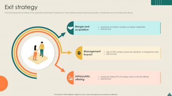 This slide displays the exit strategy of the organization which helps in reducing risk. These strategies include merger and acquisition, management buyout, and initial public offering. Do you know about Slidesgeeks Exit Strategy Financial Analytics Platform Investor Elevator Pitch Deck These are perfect for delivering any kind od presentation. Using it, create PowerPoint presentations that communicate your ideas and engage audiences. Save time and effort by using our pre-designed presentation templates that are perfect for a wide range of topic. Our vast selection of designs covers a range of styles, from creative to business, and are all highly customizable and easy to edit. Download as a PowerPoint template or use them as Google Slides themes. This slide displays the exit strategy of the organization which helps in reducing risk. These strategies include merger and acquisition, management buyout, and initial public offering.