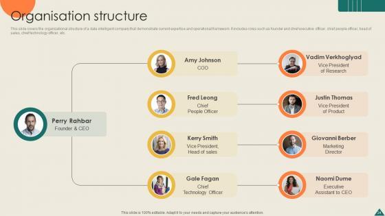 This slide covers the organizational structure of a data intelligent company that demonstrate current expertise and operational framework. It includes roles such as founder and chief executive officer, chief people officer, head of sales, chief technology officer, etc. From laying roadmaps to briefing everything in detail, our templates are perfect for you. You can set the stage with your presentation slides. All you have to do is download these easy-to-edit and customizable templates. Organisation Structure Financial Analytics Platform Investor Elevator Pitch Deck will help you deliver an outstanding performance that everyone would remember and praise you for. Do download this presentation today. This slide covers the organizational structure of a data intelligent company that demonstrate current expertise and operational framework. It includes roles such as founder and chief executive officer, chief people officer, head of sales, chief technology officer, etc.