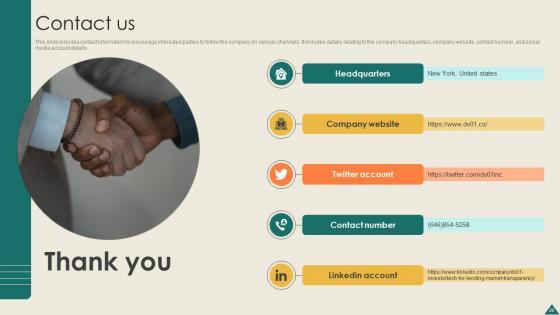 This slide includes contact information to encourage interested parties to follow the company on various channels. It includes details relating to the company headquarters, company website, contact number, and social media account details. Here you can discover an assortment of the finest PowerPoint and Google Slides templates. With these templates, you can create presentations for a variety of purposes while simultaneously providing your audience with an eye-catching visual experience. Download Contact Us Financial Analytics Platform Investor Elevator Pitch Deck to deliver an impeccable presentation. These templates will make your job of preparing presentations much quicker, yet still, maintain a high level of quality. Slidegeeks has experienced researchers who prepare these templates and write high-quality content for you. Later on, you can personalize the content by editing the Contact Us Financial Analytics Platform Investor Elevator Pitch Deck. This slide includes contact information to encourage interested parties to follow the company on various channels. It includes details relating to the company headquarters, company website, contact number, and social media account details.