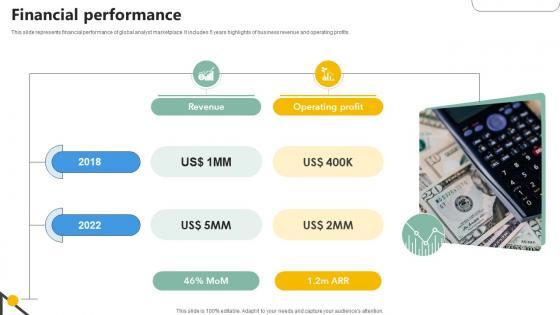 This slide represents financial performance of global analyst marketplace. It includes 5 years highlights of business revenue and operating profits.Retrieve professionally designed Financial Performance Analytics Company Investor Funding Elevator to effectively convey your message and captivate your listeners. Save time by selecting pre-made slideshows that are appropriate for various topics, from business to educational purposes. These themes come in many different styles, from creative to corporate, and all of them are easily adjustable and can be edited quickly. Access them as PowerPoint templates or as Google Slides themes. You do not have to go on a hunt for the perfect presentation because Slidegeeks got you covered from everywhere. This slide represents financial performance of global analyst marketplace. It includes 5 years highlights of business revenue and operating profits.
