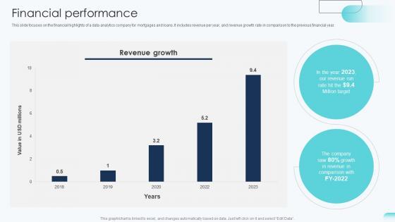 This slide focuses on the financial highlights of a data analytics company for mortgages and loans. It includes revenue per year, and revenue growth rate in comparison to the previous financial year. Find a pre-designed and impeccable Financial Performance Financial Analytics Platform Investor Elevator Pitch Deck. The templates can ace your presentation without additional effort. You can download these easy-to-edit presentation templates to make your presentation stand out from others. So, what are you waiting for Download the template from Slidegeeks today and give a unique touch to your presentation. This slide focuses on the financial highlights of a data analytics company for mortgages and loans. It includes revenue per year, and revenue growth rate in comparison to the previous financial year.