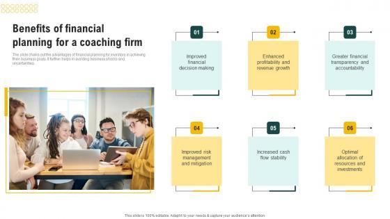 The slide chalks out the advantages of financial planning for investors in achieving their business goals. It further helps in avoiding business shocks and uncertainties. Find a pre-designed and impeccable Benefits Of Financial Planning Coaching Business Plan Financial Projections Infographics Pdf. The templates can ace your presentation without additional effort. You can download these easy-to-edit presentation templates to make your presentation stand out from others. So, what are you waiting for Download the template from Slidegeeks today and give a unique touch to your presentation. The slide chalks out the advantages of financial planning for investors in achieving their business goals. It further helps in avoiding business shocks and uncertainties.