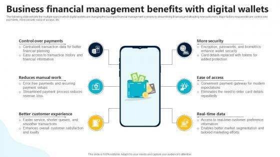 The following slide exhibits the multiple ways in which digital wallets are changing the business financial management scenario by streamlining finances and attracting new customers. Major factors responsible are control over payments, more security, ease of access, etc. Get a simple yet stunning designed Business Financial Management Benefits With In Depth Guide To Digital Wallets Fin SS V. It is the best one to establish the tone in your meetings. It is an excellent way to make your presentations highly effective. So, download this PPT today from Slidegeeks and see the positive impacts. Our easy-to-edit Business Financial Management Benefits With In Depth Guide To Digital Wallets Fin SS V can be your go-to option for all upcoming conferences and meetings. So, what are you waiting for Grab this template today. The following slide exhibits the multiple ways in which digital wallets are changing the business financial management scenario by streamlining finances and attracting new customers. Major factors responsible are control over payments, more security, ease of access, etc.