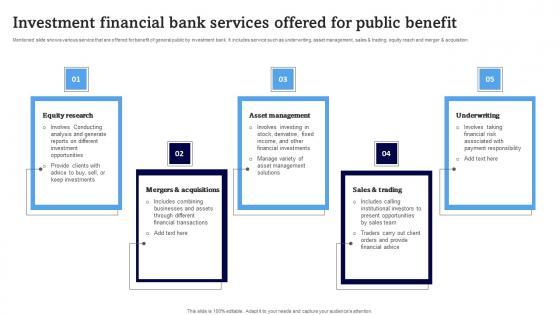 Mentioned slide shows various service that are offered for benefit of general public by investment bank. It includes service such as underwriting, asset management, sales and trading, equity reach and merger and acquisition. Showcasing this set of slides titled Investment Financial Bank Services Offered For Public Benefit Background Pdf. The topics addressed in these templates are Equity Research, Mergers Acquisitions, Asset Management. All the content presented in this PPT design is completely editable. Download it and make adjustments in color, background, font etc. as per your unique business setting. Mentioned slide shows various service that are offered for benefit of general public by investment bank. It includes service such as underwriting, asset management, sales and trading, equity reach and merger and acquisition.