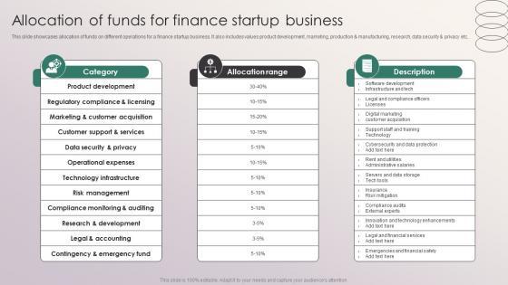 This slide showcases allocation of funds on different operations for a finance startup business. It also includes values product development, marketing, production and manufacturing, research, data security and privacy etc. Boost your pitch with our creative Allocation Of Funds For Finance Startup Business Penetrating Markets With Financial Strategy SS V. Deliver an awe inspiring pitch that will mesmerize everyone. Using these presentation templates you will surely catch everyones attention. You can browse the ppts collection on our website. We have researchers who are experts at creating the right content for the templates. So you do not have to invest time in any additional work. Just grab the template now and use them. This slide showcases allocation of funds on different operations for a finance startup business. It also includes values product development, marketing, production and manufacturing, research, data security and privacy etc.