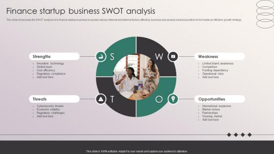 This slide showcases the SWOT analysis of a finance startup business to assess various internal and external factors affecting business and assess business position to formulate an effective growth strategy. Slidegeeks is here to make your presentations a breeze with Finance Startup Business SWOT Analysis Strategy For Launching A Financial Strategy SS V With our easy-to-use and customizable templates, you can focus on delivering your ideas rather than worrying about formatting. With a variety of designs to choose from, you are sure to find one that suits your needs. And with animations and unique photos, illustrations, and fonts, you can make your presentation pop. So whether you are giving a sales pitch or presenting to the board, make sure to check out Slidegeeks first This slide showcases the SWOT analysis of a finance startup business to assess various internal and external factors affecting business and assess business position to formulate an effective growth strategy.