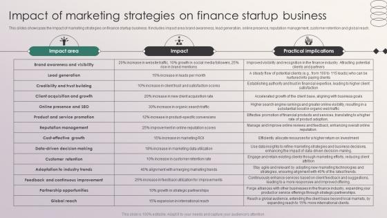 This slides showcases the Impact of marketing strategies on finance startup business. It includes impact area brand awareness, lead generation, online presence, reputation management, customer retention and global reach. Formulating a presentation can take up a lot of effort and time, so the content and message should always be the primary focus. The visuals of the PowerPoint can enhance the presenters message, so our Impact Of Marketing Strategies On Finance Startup Business Penetrating Markets With Financial Strategy SS V was created to help save time. Instead of worrying about the design, the presenter can concentrate on the message while our designers work on creating the ideal templates for whatever situation is needed. Slidegeeks has experts for everything from amazing designs to valuable content, we have put everything into Impact Of Marketing Strategies On Finance Startup Business Penetrating Markets With Financial Strategy SS V This slides showcases the Impact of marketing strategies on finance startup business. It includes impact area brand awareness, lead generation, online presence, reputation management, customer retention and global reach.