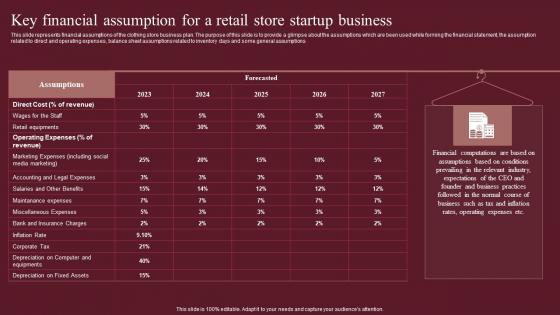 This slide represents financial assumptions of the clothing store business plan. The purpose of this slide is to provide a glimpse about the assumptions which are been used while forming the financial statement, the assumption related to direct and operating expenses, balance sheet assumptions related to inventory days and some general assumptions. Welcome to our selection of the Key Financial Assumption For A Retail Store Startup Business Fashion Business Plan Formats Pdf. These are designed to help you showcase your creativity and bring your sphere to life. Planning and Innovation are essential for any business that is just starting out. This collection contains the designs that you need for your everyday presentations. All of our PowerPoints are 100 percent editable, so you can customize them to suit your needs. This multi-purpose template can be used in various situations. Grab these presentation templates today This slide represents financial assumptions of the clothing store business plan. The purpose of this slide is to provide a glimpse about the assumptions which are been used while forming the financial statement, the assumption related to direct and operating expenses, balance sheet assumptions related to inventory days and some general assumptions.