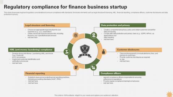 This slide showcases legal and regulatory considerations to ensure compliance with standards. It includes elements such as legal structure and licensing, AML, financial reporting, compliance officers, customer disclosures and data protection and privacy. This Regulatory Compliance For Finance Business Startup Strategy For Launching A Financial Strategy SS V from Slidegeeks makes it easy to present information on your topic with precision. It provides customization options, so you can make changes to the colors, design, graphics, or any other component to create a unique layout. It is also available for immediate download, so you can begin using it right away. Slidegeeks has done good research to ensure that you have everything you need to make your presentation stand out. Make a name out there for a brilliant performance. This slide showcases legal and regulatory considerations to ensure compliance with standards. It includes elements such as legal structure and licensing, AML, financial reporting, compliance officers, customer disclosures and data protection and privacy.