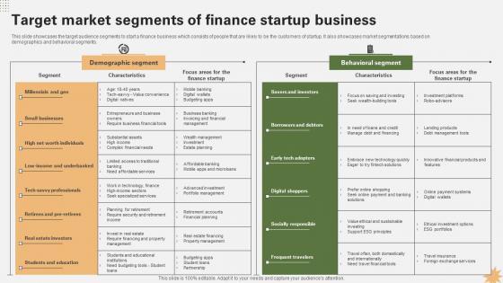 This slide showcases the target audience segments to start a finance business which consists of people that are likely to be the customers of startup. It also showcases market segmentations based on demographics and behavioral segments. Welcome to our selection of the Target Market Segments Of Finance Startup Business Strategy For Launching A Financial Strategy SS V. These are designed to help you showcase your creativity and bring your sphere to life. Planning and Innovation are essential for any business that is just starting out. This collection contains the designs that you need for your everyday presentations. All of our PowerPoints are 100Percent editable, so you can customize them to suit your needs. This multi-purpose template can be used in various situations. Grab these presentation templates today. This slide showcases the target audience segments to start a finance business which consists of people that are likely to be the customers of startup. It also showcases market segmentations based on demographics and behavioral segments.
