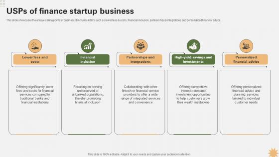 This slide showcases the unique selling points of business. It includes USPs such as lower fees and costs, financial inclusion, partnerships and integrations and personalized financial advice. Are you searching for a USPs Of Finance Startup Business Strategy For Launching A Financial Strategy SS V that is uncluttered, straightforward, and original Its easy to edit, and you can change the colors to suit your personal or business branding. For a presentation that expresses how much effort you have put in, this template is ideal With all of its features, including tables, diagrams, statistics, and lists, its perfect for a business plan presentation. Make your ideas more appealing with these professional slides. Download USPs Of Finance Startup Business Strategy For Launching A Financial Strategy SS V from Slidegeeks today. This slide showcases the unique selling points of business. It includes USPs such as lower fees and costs, financial inclusion, partnerships and integrations and personalized financial advice.