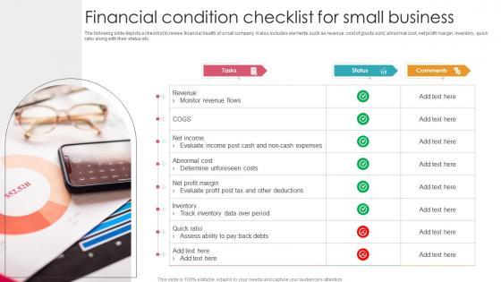 The following slide depicts a checklist to review financial health of small company. It also includes elements such as revenue, cost of goods sold, abnormal cost, net profit margin, inventory, quick ratio along with their status etc. Pitch your topic with ease and precision using this Financial Condition Checklist For Small Business Demonstration Pdf. This layout presents information on Revenue, Monitor Revenue Flows, Evaluate Income Post. It is also available for immediate download and adjustment. So, changes can be made in the color, design, graphics or any other component to create a unique layout. The following slide depicts a checklist to review financial health of small company. It also includes elements such as revenue, cost of goods sold, abnormal cost, net profit margin, inventory, quick ratio along with their status etc.