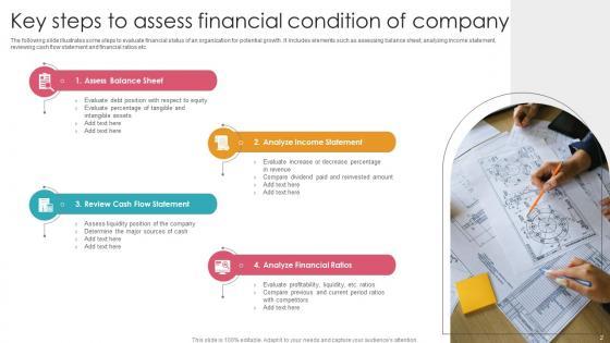 The following slide illustrates some steps to evaluate financial status of an organization for potential growth. It includes elements such as assessing balance sheet, analyzing income statement, reviewing cash flow statement and financial ratios etc. Pitch your topic with ease and precision using this Key Steps To Assess Financial Condition Of Company Ideas Pdf. This layout presents information on Assess Balance Sheet, Analyze Income Statement, Analyze Financial Ratios. It is also available for immediate download and adjustment. So, changes can be made in the color, design, graphics or any other component to create a unique layout. The following slide illustrates some steps to evaluate financial status of an organization for potential growth. It includes elements such as assessing balance sheet, analyzing income statement, reviewing cash flow statement and financial ratios etc.