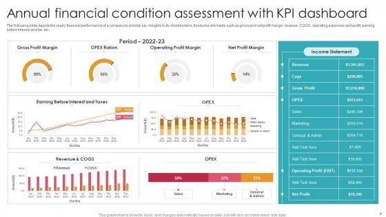 The following slide depicts the yearly financial performance of a company to provide key insights to its stakeholders. It includes elements such as gross and net profit margin, revenue, COGS, operating expenses and profit, earning before interest and tax etc. Showcasing this set of slides titled Annual Financial Condition Assessment With KPI Dashboard Ideas Pdf. The topics addressed in these templates are Gross Profit Margin, Operating Profit Margin, Net Profit Margin. All the content presented in this PPT design is completely editable. Download it and make adjustments in color, background, font etc. as per your unique business setting. The following slide depicts the yearly financial performance of a company to provide key insights to its stakeholders. It includes elements such as gross and net profit margin, revenue, COGS, operating expenses and profit, earning before interest and tax etc.