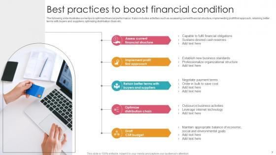 The following slide illustrates some tips to optimize financial performance. It also includes activities such as assessing current financial structure, implementing profit first approach, retaining better terms with buyers and suppliers, optimizing distribution chain etc. Pitch your topic with ease and precision using this Best Practices To Boost Financial Condition Brochure Pdf. This layout presents information on Assess Current Financial Structure, Implement Profit First Approach, Optimize Distribution Chain. It is also available for immediate download and adjustment. So, changes can be made in the color, design, graphics or any other component to create a unique layout. The following slide illustrates some tips to optimize financial performance. It also includes activities such as assessing current financial structure, implementing profit first approach, retaining better terms with buyers and suppliers, optimizing distribution chain etc.