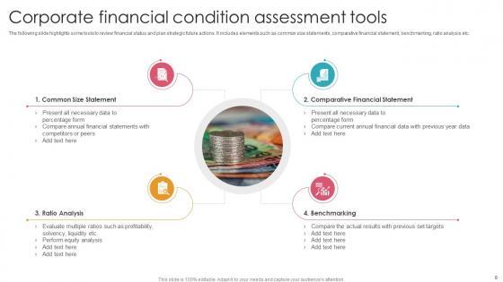 The following slide highlights some tools to review financial status and plan strategic future actions. It includes elements such as common size statements, comparative financial statement, benchmarking, ratio analysis etc. Showcasing this set of slides titled Corporate Financial Condition Assessment Tools Sample Pdf. The topics addressed in these templates are Common Size Statement, Comparative Financial Statement, Benchmarking. All the content presented in this PPT design is completely editable. Download it and make adjustments in color, background, font etc. as per your unique business setting. The following slide highlights some tools to review financial status and plan strategic future actions. It includes elements such as common size statements, comparative financial statement, benchmarking, ratio analysis etc.