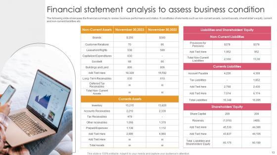 The following slide showcases the financial summary to review business performance and status. It constitutes of elements such as non-current assets, current assets, shareholders equity, current and non-current liabilities etc. Pitch your topic with ease and precision using this Financial Statement Analysis To Assess Business Condition Formats Pdf. This layout presents information on Customer Relations, Leasehold Rights, Buildings Land. It is also available for immediate download and adjustment. So, changes can be made in the color, design, graphics or any other component to create a unique layout. The following slide showcases the financial summary to review business performance and status. It constitutes of elements such as non-current assets, current assets, shareholders equity, current and non-current liabilities etc.