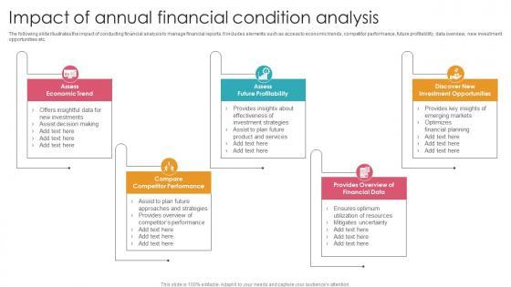 The following slide illustrates the impact of conducting financial analysis to manage financial reports. It includes elements such as access to economic trends, competitor performance, future profitability, data overview, new investment opportunities etc. Showcasing this set of slides titled Impact Of Annual Financial Condition Analysis Template Pdf. The topics addressed in these templates are Assess Economic Trend, Assess Future Profitability, Discover Investment Opportunities. All the content presented in this PPT design is completely editable. Download it and make adjustments in color, background, font etc. as per your unique business setting. The following slide illustrates the impact of conducting financial analysis to manage financial reports. It includes elements such as access to economic trends, competitor performance, future profitability, data overview, new investment opportunities etc.