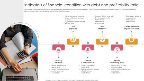 The following slide highlights positive signs of financial health to determine business performance wellness. It also includes elements such as growing revenue, flat expenses, positive cash balance, low debt ratio, new and repetitive clients, high profitability ratio etc. Pitch your topic with ease and precision using this Indicators Of Financial Condition With Debt And Profitability Ratio Ideas Pdf. This layout presents information on Growing Revenue, Positive Cash Balance, Healthy Profitability Ratio. It is also available for immediate download and adjustment. So, changes can be made in the color, design, graphics or any other component to create a unique layout. The following slide highlights positive signs of financial health to determine business performance wellness. It also includes elements such as growing revenue, flat expenses, positive cash balance, low debt ratio, new and repetitive clients, high profitability ratio etc.