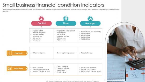 The following slide highlights some key indicators to review financial health of small organization. It also includes elements such as manages, plans and capital along with signs good, caution and at risk etc. Showcasing this set of slides titled Small Business Financial Condition Indicators Themes Pdf. The topics addressed in these templates are Elements, Indicators, Sustains Desired Cash Reserves. All the content presented in this PPT design is completely editable. Download it and make adjustments in color, background, font etc. as per your unique business setting. The following slide highlights some key indicators to review financial health of small organization. It also includes elements such as manages, plans and capital along with signs good, caution and at risk etc.