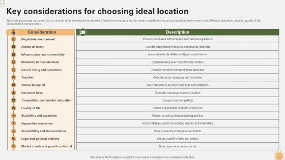 This Key Considerations For Choosing Ideal Location Strategy For Launching A Financial Strategy SS V is perfect for any presentation, be it in front of clients or colleagues. It is a versatile and stylish solution for organizing your meetings. The Key Considerations For Choosing Ideal Location Strategy For Launching A Financial Strategy SS V features a modern design for your presentation meetings. The adjustable and customizable slides provide unlimited possibilities for acing up your presentation. Slidegeeks has done all the homework before launching the product for you. So, do not wait, grab the presentation templates today This slide showcases various factors to consider while selecting the location for a finance business startup. It includes considerations such as regulatory environment, cost of living and operations, taxation, quality of life, accessibility and transportation.