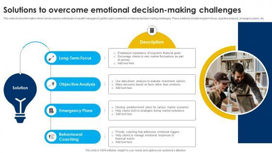 This slide shows information which can be used by individuals or wealth managers to get the right solution for emotional decision making challenges. These solutions include long term focus, objective analysis, emergency plans, etc. Present like a pro with Solutions To Overcome Emotional Decision Strategic Wealth Management And Financial Fin SS V. Create beautiful presentations together with your team, using our easy-to-use presentation slides. Share your ideas in real-time and make changes on the fly by downloading our templates. So whether youre in the office, on the go, or in a remote location, you can stay in sync with your team and present your ideas with confidence. With Slidegeeks presentation got a whole lot easier. Grab these presentations today. This slide shows information which can be used by individuals or wealth managers to get the right solution for emotional decision making challenges. These solutions include long term focus, objective analysis, emergency plans, etc.