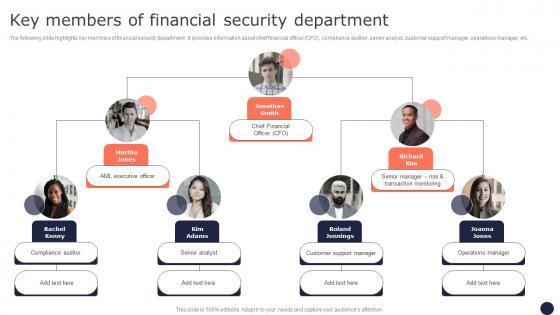The following slide highlights key members of financial security department . It provides information about chief financial officer CFO, compliance auditor, senior analyst, customer support manager, operations manager, etc. This modern and well-arranged Deploying Banking Transaction Key Members Of Financial Security Department Guidelines PDF provides lots of creative possibilities. It is very simple to customize and edit with the Powerpoint Software. Just drag and drop your pictures into the shapes. All facets of this template can be edited with Powerpoint, no extra software is necessary. Add your own material, put your images in the places assigned for them, adjust the colors, and then you can show your slides to the world, with an animated slide included.