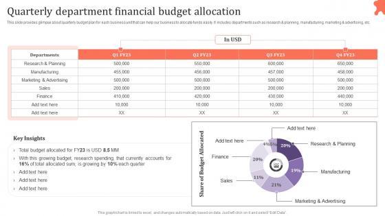 This slide provides glimpse about quarterly budget plan for each business unit that can help our business to allocate funds easily. It includes departments such as research and planning, manufacturing, marketing and advertising, etc. Are you searching for a Adjusting Financial Strategies And Planning Quarterly Department Financial Budget Allocation Download PDF that is uncluttered, straightforward, and original Its easy to edit, and you can change the colors to suit your personal or business branding. For a presentation that expresses how much effort you have put in, this template is ideal. With all of its features, including tables, diagrams, statistics, and lists, its perfect for a business plan presentation. Make your ideas more appealing with these professional slides. Download Adjusting Financial Strategies And Planning Quarterly Department Financial Budget Allocation Download PDF from Slidegeeks today.