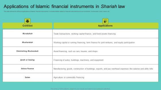 This slide defines the different applications of Islamic financial instruments. It includes details related to financial instruments such as murabahah, musharakah, ijarah, salam, etc. There are so many reasons you need a Applications Of Islamic Financial Instruments In Shariah Comprehensive Guide To Islamic Infographics Pdf. The first reason is you can not spend time making everything from scratch, Thus, Slidegeeks has made presentation templates for you too. You can easily download these templates from our website easily. This slide defines the different applications of Islamic financial instruments. It includes details related to financial instruments such as murabahah, musharakah, ijarah, salam, etc.