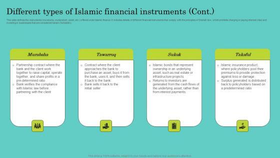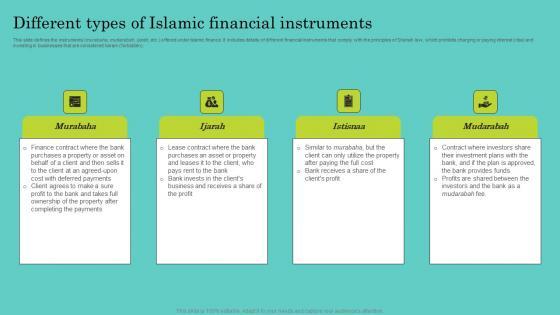 This slide defines the instruments murabaha, mudarabah, ijarah, etc. offered under Islamic finance. It includes details of different financial instruments that comply with the principles of Shariah law, which prohibits charging or paying interest riba and investing in businesses that are considered haram forbidden. Formulating a presentation can take up a lot of effort and time, so the content and message should always be the primary focus. The visuals of the PowerPoint can enhance the presenters message, so our Different Types Of Islamic Financial Instruments Comprehensive Guide To Islamic Brochure Pdf was created to help save time. Instead of worrying about the design, the presenter can concentrate on the message while our designers work on creating the ideal templates for whatever situation is needed. Slidegeeks has experts for everything from amazing designs to valuable content, we have put everything into Different Types Of Islamic Financial Instruments Comprehensive Guide To Islamic Brochure Pdf This slide defines the instruments murabaha, mudarabah, ijarah, etc. offered under Islamic finance. It includes details of different financial instruments that comply with the principles of Shariah law, which prohibits charging or paying interest riba and investing in businesses that are considered haram forbidden.