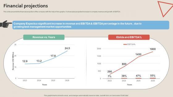 This slide presents the financial projection of the company with the help of line graphs. It showcases projected increase in company revenue and growth of EBITDA.Slidegeeks is here to make your presentations a breeze with Financial Projections Work Management Tool Pitch Deck With our easy-to-use and customizable templates, you can focus on delivering your ideas rather than worrying about formatting. With a variety of designs to choose from, you are sure to find one that suits your needs. And with animations and unique photos, illustrations, and fonts, you can make your presentation pop. So whether you are giving a sales pitch or presenting to the board, make sure to check out Slidegeeks first This slide presents the financial projection of the company with the help of line graphs. It showcases projected increase in company revenue and growth of EBITDA.
